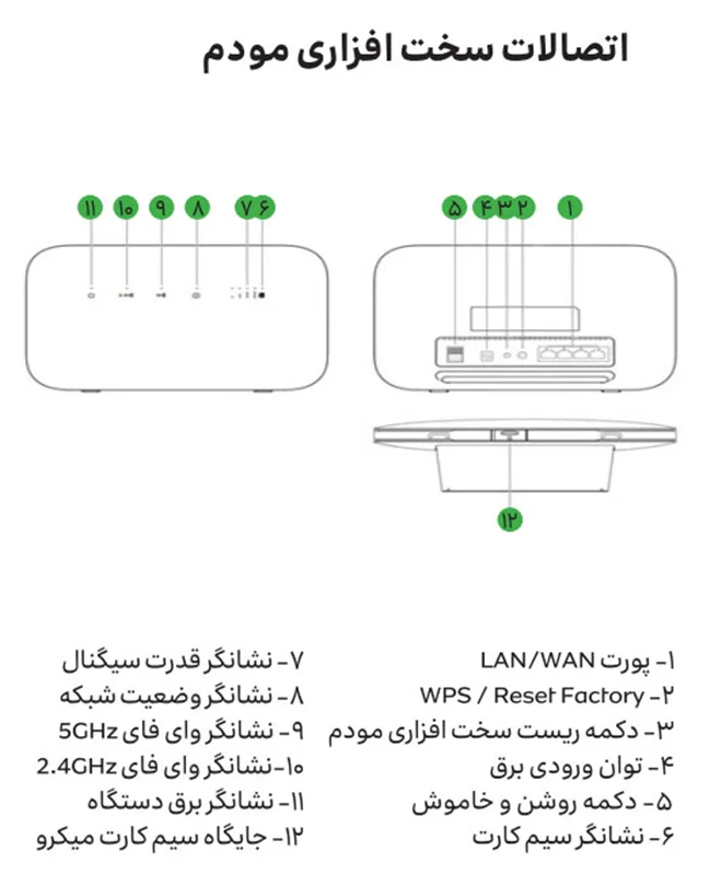 چراغ های LED در قسمت جلویی این مودم نشانگر وضعیت مودم میباشد. با استفاده از این چراغ ها میتوان قدرت سیگنال و کیفیت آنتن دهی دستگاه را بررسی کرد. در قسمت پشتی این مودم نیز 4 عدد درگاه LAN/WAN، کلید خاموش و روشن و دکمه ریست وجود دارد. در قسمت پایینی این مودم نیز محلی برای قرار گیری سیم کارت وحود دارد.