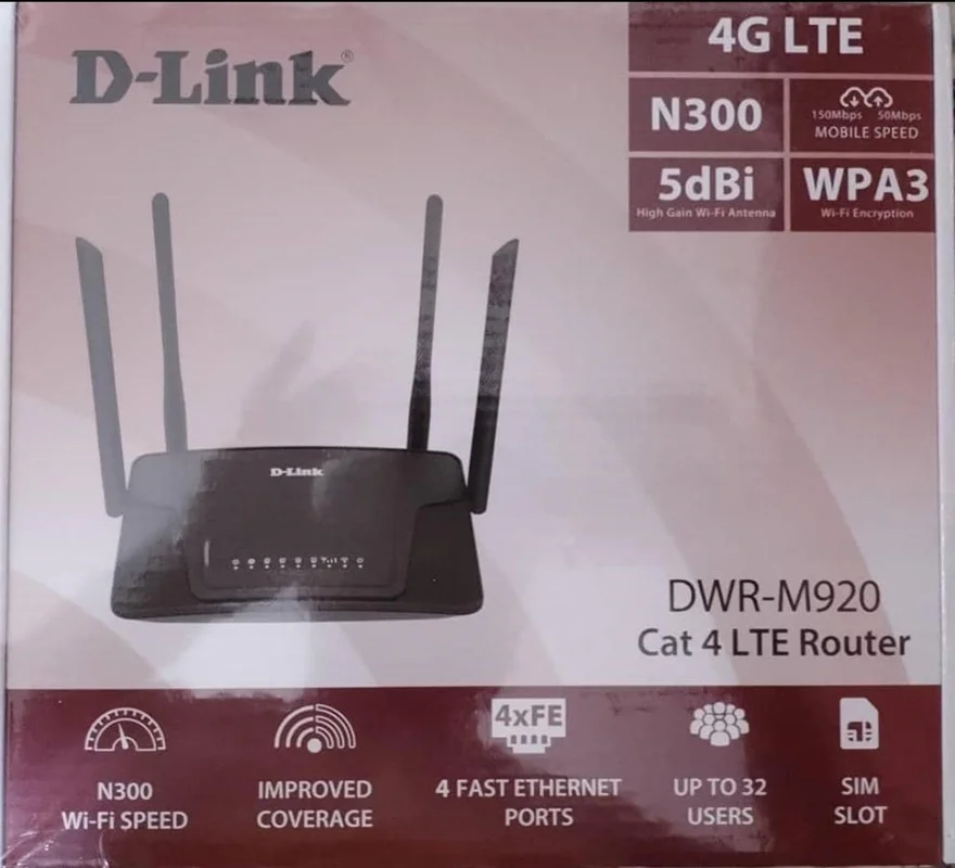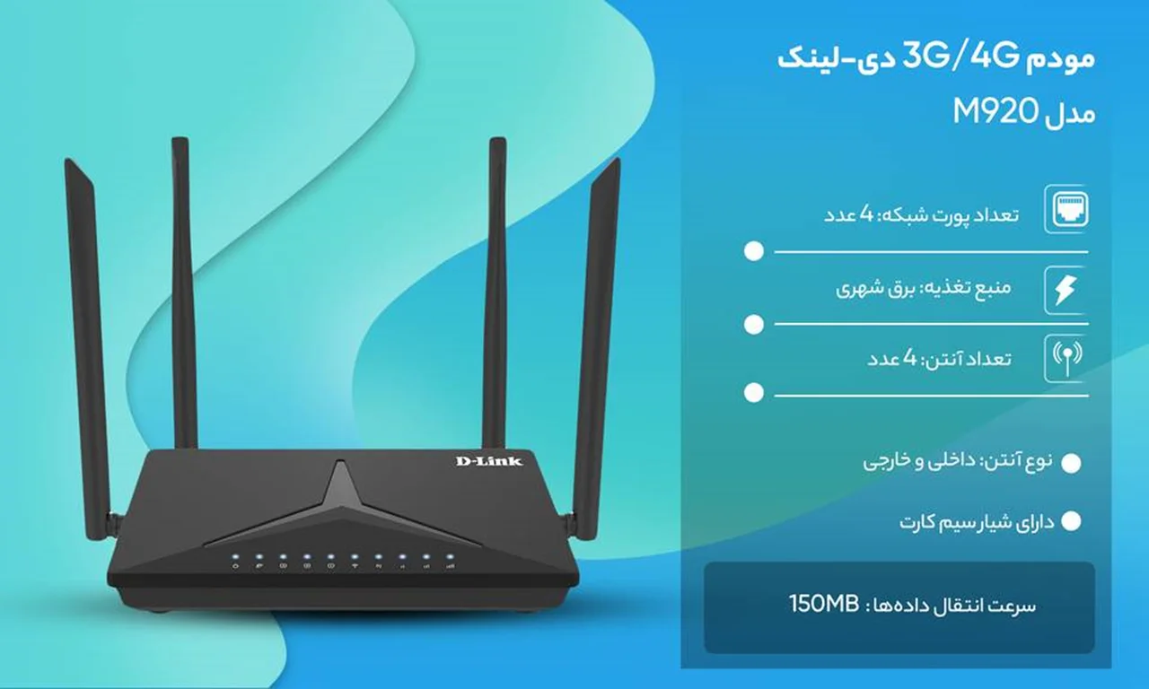 روتر بی سیم 4G/LTE دی-لینک مدل DWR-M920 محصولی از شرکت «دی- لینک » است. این روتر شرکت دی-لینک دارای یک درگاه برای نصب سیمکارت است که میتوانید از سیمکارت تمام اپراتورها استفاده کنید. در کنار شیار سیمکارت، چهار درگاه LAN وجود دارد که میتوان از آن برای اتصال باسیم ابزارها به شبکه بیسیم استفاده کرد. همچنین این دستگاه میتواند از طریق اتصال WAN به اینترنت فعلی شما وصل میشود. این اتصال میتواند شامل یک اینترنت پهنباند باشد که به وسیله آنتنهای پوینت تو پوینت (P2P) وایرلس دریافت میکنید یا همان اتصال ADSL خانگیتان که مدتها از آن استفاده کردهاید. برای این دستگاه چهار عدد آنتن در نظر گرفته شده است که دوتای آنها برای اتصال آنتنهای 3G/4G است و دو تای دیگر برای آنتنهای شبکهی وایفای هستند. در قسمت پشت روتر DWR-M920 کلیدهای WPS و Reset و کلید روشن و خاموش قرار گرفته است.