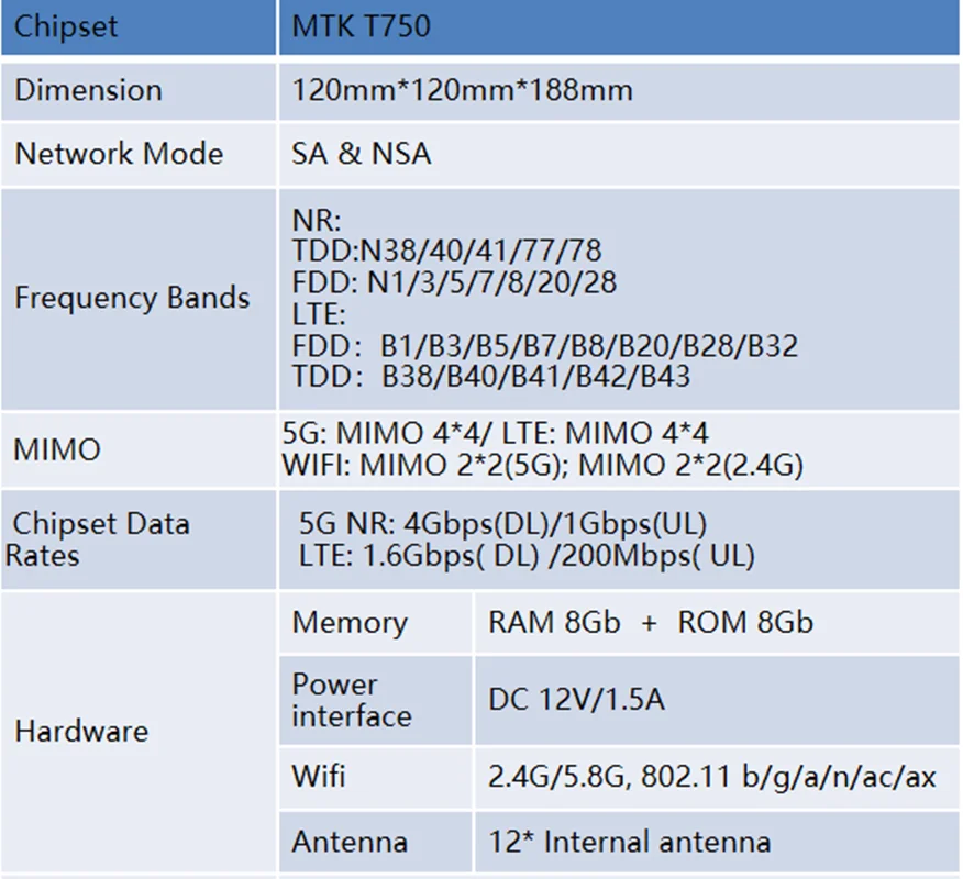 | NR: TDD:N38/40/41/77/78 FDD:N1/3/5/7/8/20/28 LTE: FDD:B1/B3/B5/B7/B8/B20/B28/B32 TDD:B38/B40/B41/B42/B43 |
